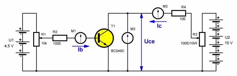 Omdat de uitgangskarakteristiek in hoge mate afhankelijk is van de basisstroom, moet u in ieder geval een aantal karakteristieken opmeten, ieder bij een bepaalde constante basisstroom. Vandaar dat de basis via een beveiligingsweerstand R1 wordt aangesloten op een regelbare voeding via R1. Hetzelfde gebeurt met de collector. In de basis en de collector worden stroommeters M1 en M2 opgenomen. Tussen de collector en de emitter wordt een spanningsmeter M3 geschakeld.