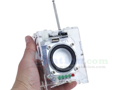 In de onderstaande foto ziet u het eindresultaat van dit bouwpakket. Een transparant kastje met als afmetingen 10,0 cm bij 7,7 cm bij 4,8 cm met een antenne van ongeveer 25 cm. Aan de voorzijde zit een luidsprekertje met een conusdiameter van 46 mm. Daaronder staat een primitieve VU-meter met vijf LED's. Op de bovenzijde is het eigenlijke player-printje gemonteerd, dat u kunt bedienen met vier uiterst kleine drukknopjes. Op de achterzijde is plaats voor een 3,7 V polymeer-lithium accu, die echter niet wordt meegeleverd. Dergelijke onderdelen schijnen niet mee te mogen in de vrachtruimte van een vliegtuig. Zo'n accuutje kost bij Reichelt ongeveer een tientje. Op de achterzijde zitten verder de AAN/UIT-schakelaar en een voedingsplug, waarmee u het apparaatje op een 5 V USB-voeding kunt aansluiten voor het opladen van de accu en het voeden van de player als u 230 V in de buurt hebt.