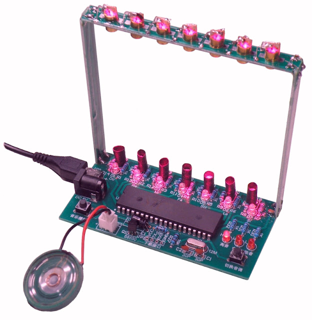 U kunt nu het luidsprekertje aansluiten en met de twee drukknopjes de drie geprogrammeerde melodietjes beluisteren. Als alles werkt zoals het hoort kunt u eventueel met tien seconden lijm de toch wel fragiele verbindingshoeken tussen de vier printen verstevigen.